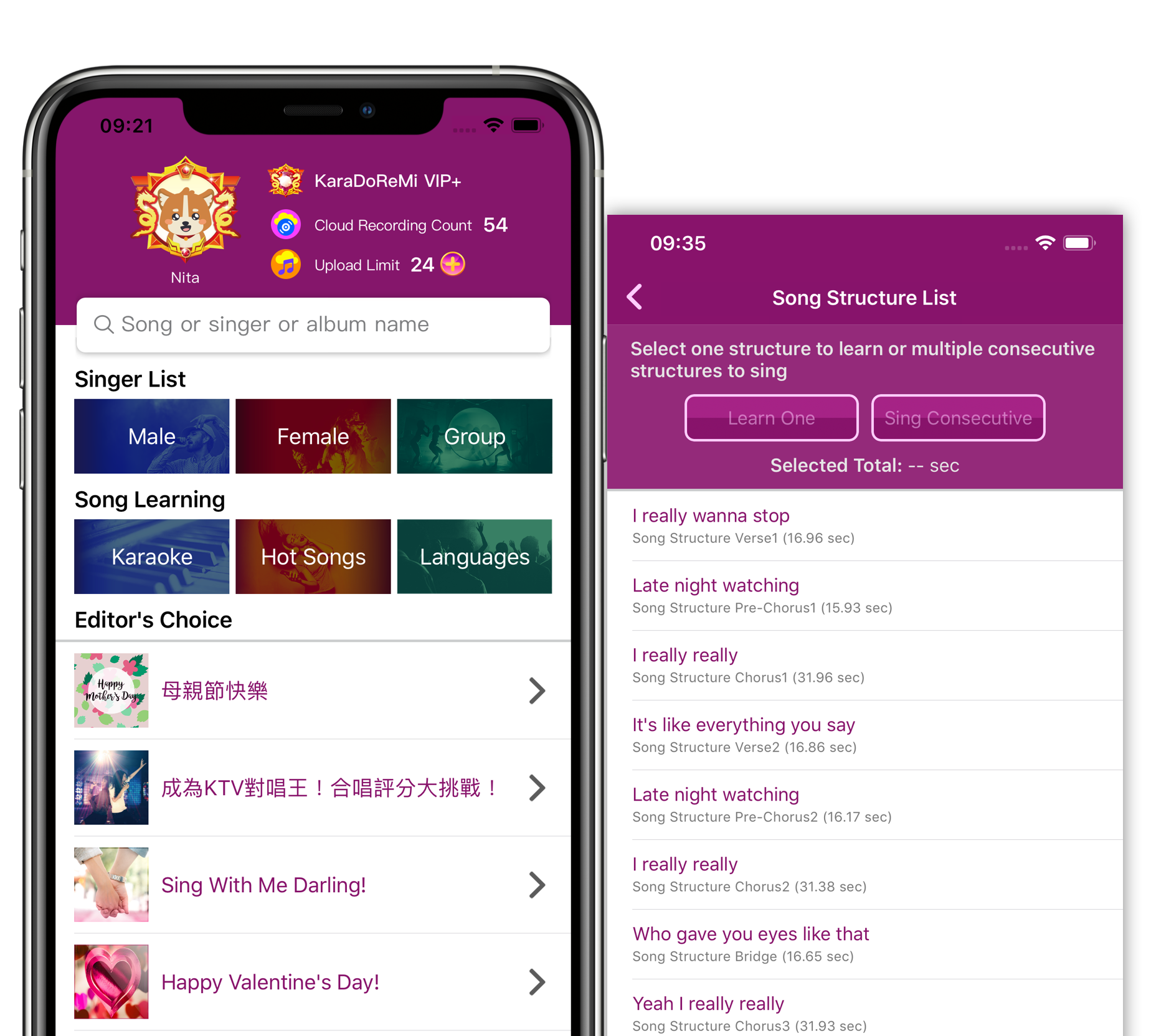 Various categories: Hot Songs, Singer List, Backing Only (Karaoke version), and Editor's Choice, etc. help you find songs to learn