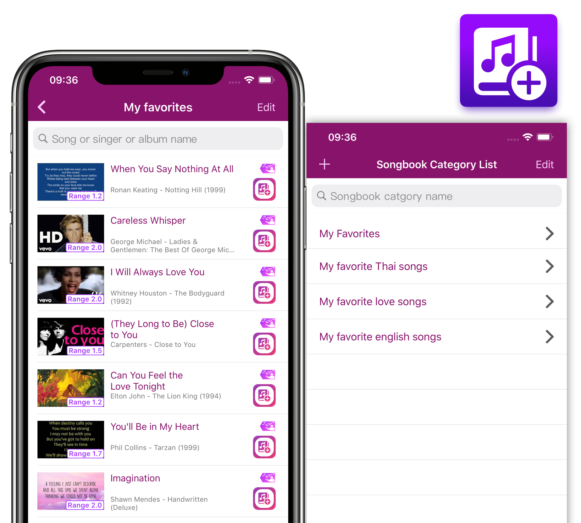 Create your own songbooks. You can quickly pick one of your songbooks that best fits your mood, place, and special days to learn or sing