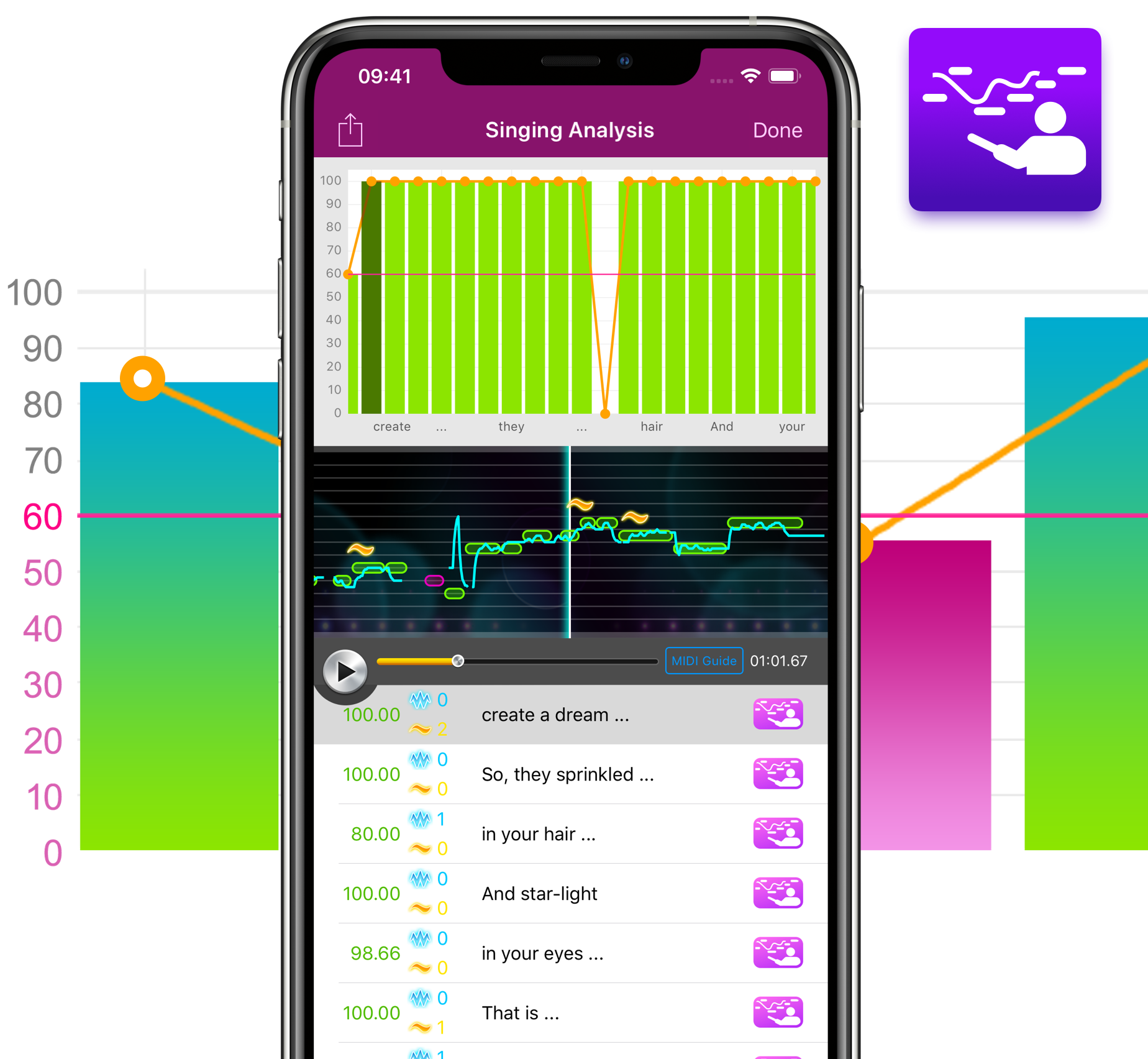 Our unique and powerful scoring engine can accurately evaluate your singing performance. Our powerful singing analysis function combines line chart of scores by each line of song lyrics and graph of your vocal pitch and original singer's vocal pitch to help you quickly pinpoint your weakness of singing. And then you can practice those lines of song lyrics repeatedly by singing along with YouTube video