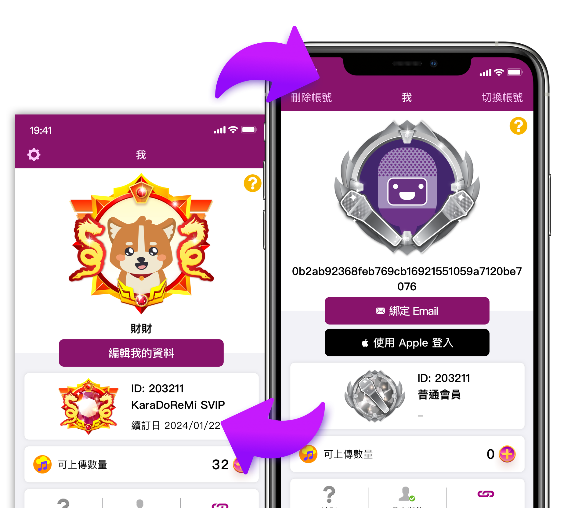 選擇綁定Email或Apple帳號開啟更多功能, 包含雲端儲存空間, 演唱分析, 我的歌本, 與全球競賽排行。