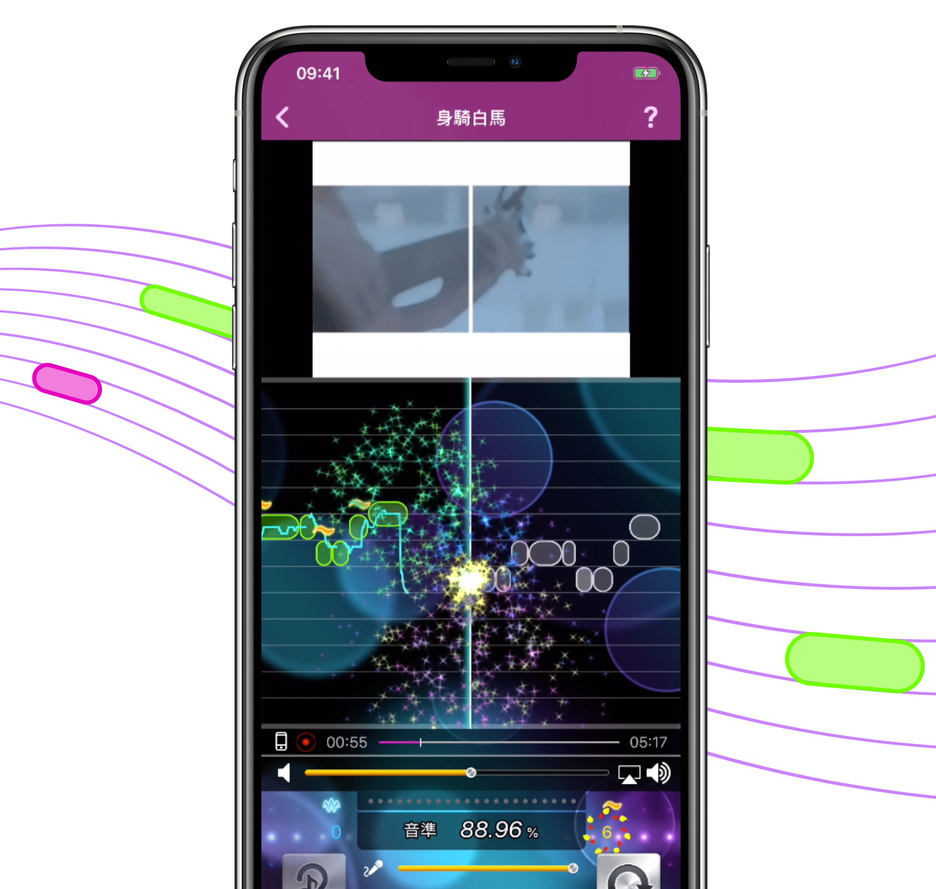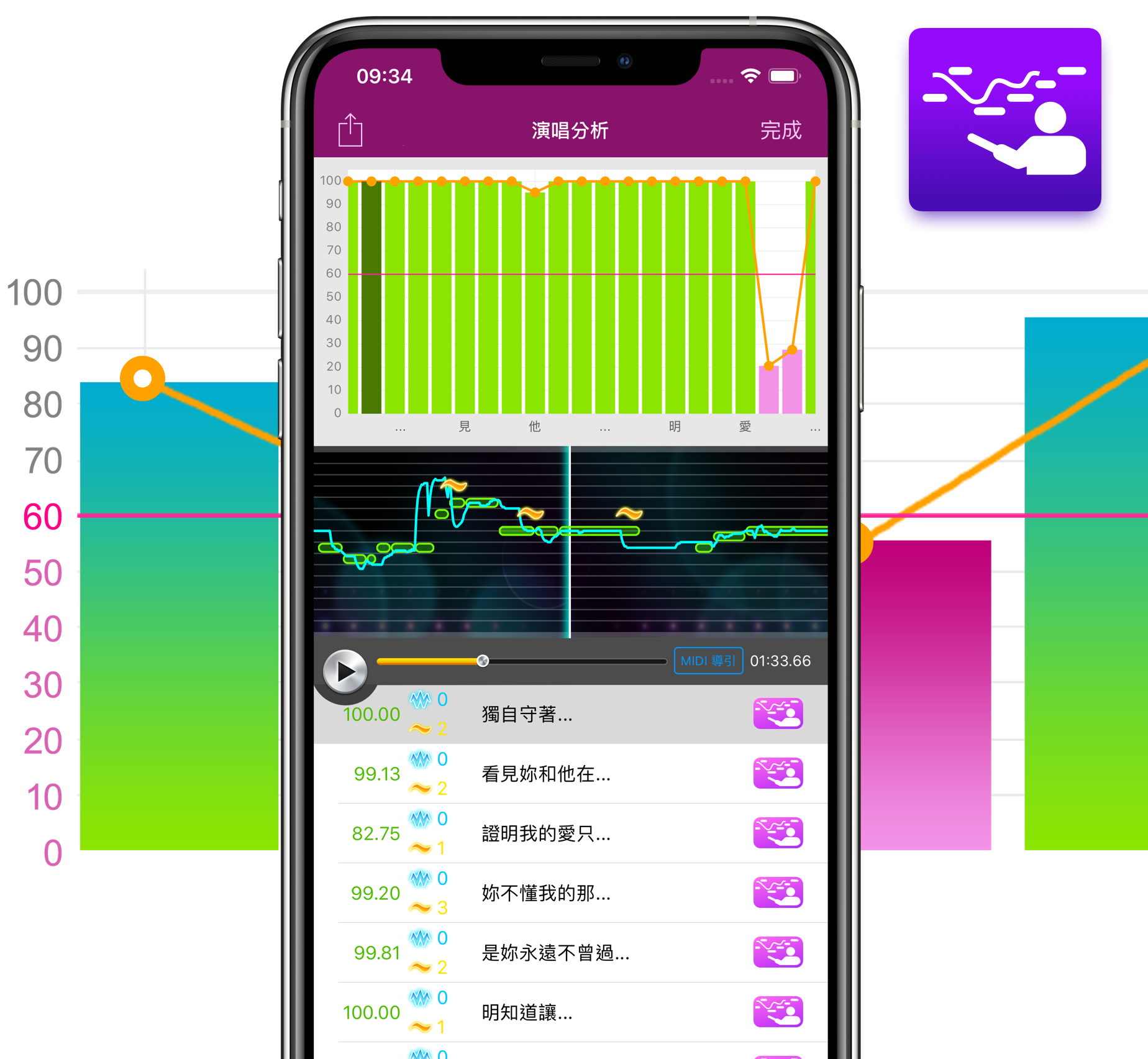 我們獨特且強大的評分引擎, 能深度分析您的演唱, 並且以歌曲每句分數圖表結合您的聲線及原唱音高, 讓您可以從各面向快速找出您的演唱弱項, 再搭配YouTube影片進行單句重覆學習